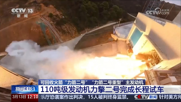 3月13日,CCTV13《新闻30分》报道了中科宇航自主研制的110吨级力擎二号针栓式液氧煤油发动机完成长程试车情况。中国节能下属中国启源所属新时代(西安)设计研究院有限公司承担了该火箭发动机试车台的设计任务。