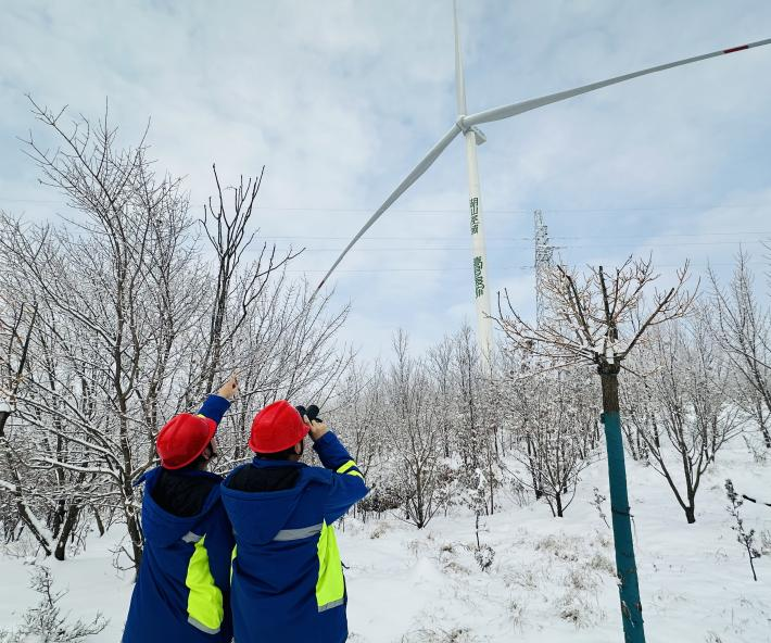 面对冬季寒潮、气温多变等挑战,各区域公司变“被动应对”为“主动预防”,提前对风电机组、升压站、集电线路等关键设备开展防寒防冻特巡与隐患排查治理。位于四川省的云顶山风电场严格执行春节期间保电及防寒防冻措施,全面应对极端天气可能带来的设备停电、风机停机等突发情况,最终确保了央视春晚四川宜宾分会场及地方供电的万无一失。 创新联动,绿电直通破解用电难 鲁豫区域公司结合河南电网“御冰”行动统筹安排,积极构建“空中无人机巡检+线上数据监控+现场望远镜观测”的“空天地”一体化智慧巡检体系,针对冬季风机覆冰、线路防冻等关键问题,与省电科院、市电力调度控制中心专业力量紧密联动,依托风机机组负荷曲线、设备运行状态及温湿度、风速等实时监测数据,协同破解极端低温环境下风机覆冰停运等运维技术难题,为电网安全稳定运行筑起了坚实防线。