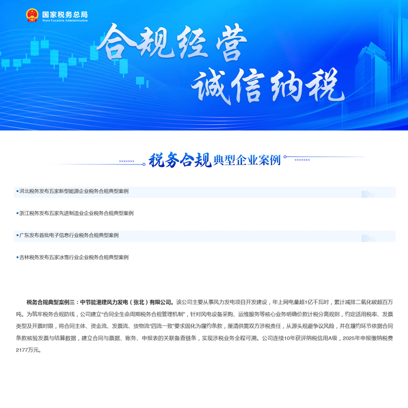 近日,风电公司所属中节能港建风力发电(张北)有限公司入选国家税务总局“税务合规典型企业案例”。此次入选税务合规典型案例,不仅是税务部门对公司长期规范税务管理、坚守合规底线的高度认可,更是对公司在新型能源领域税务管理创新实践的充分肯定。